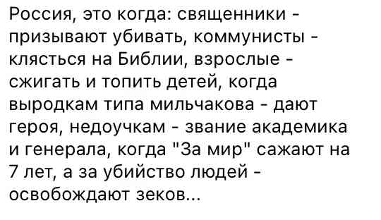 Поскольку РПЦ в лице Гундяева, например, благословляет путина на победу над врагами, одновременно называя украинцев братьями и отрицает агрессию россии. Более мелкие священники РПЦ идут гораздо дальше в своих проповедях, открыто призывая убивать украинцев. Это, мол, не грех.