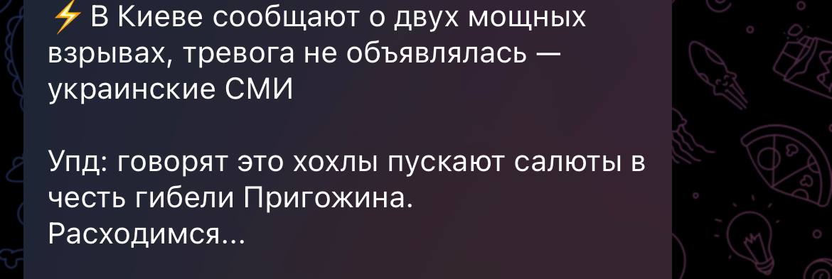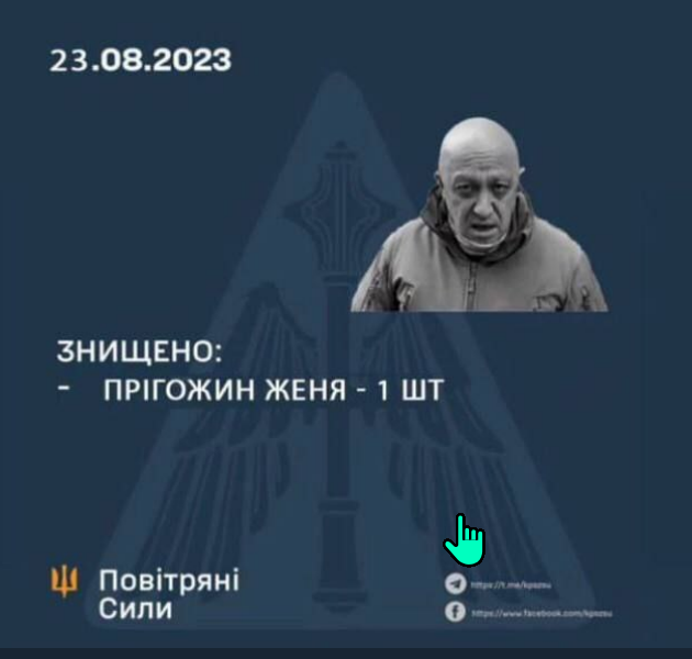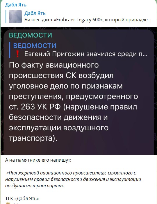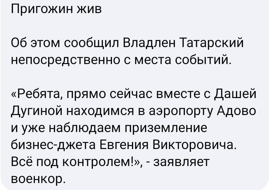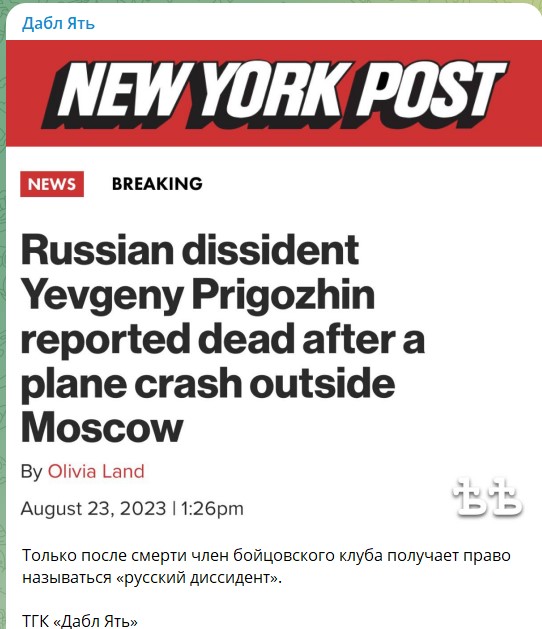 О "смерти" же Евгения Пригожина в сбитом (скорее всего), ну или взорванном самолете в Тверской области сначала сообщили самые заслуживающие доверия компетентные источники - Ксения Собчак и издание "Фонтанка", - а потом и еще более заслуживающие внимания федеральные телеканалы, так что я почти уверен, что это такая операция по договоренному исчезновению Пригожина из зоны видимости, а дальше он всплывет где-нибудь в Африке под именем Исаак Момбасович Чингачгук или Сара Лжеевгеньевна Африканских.