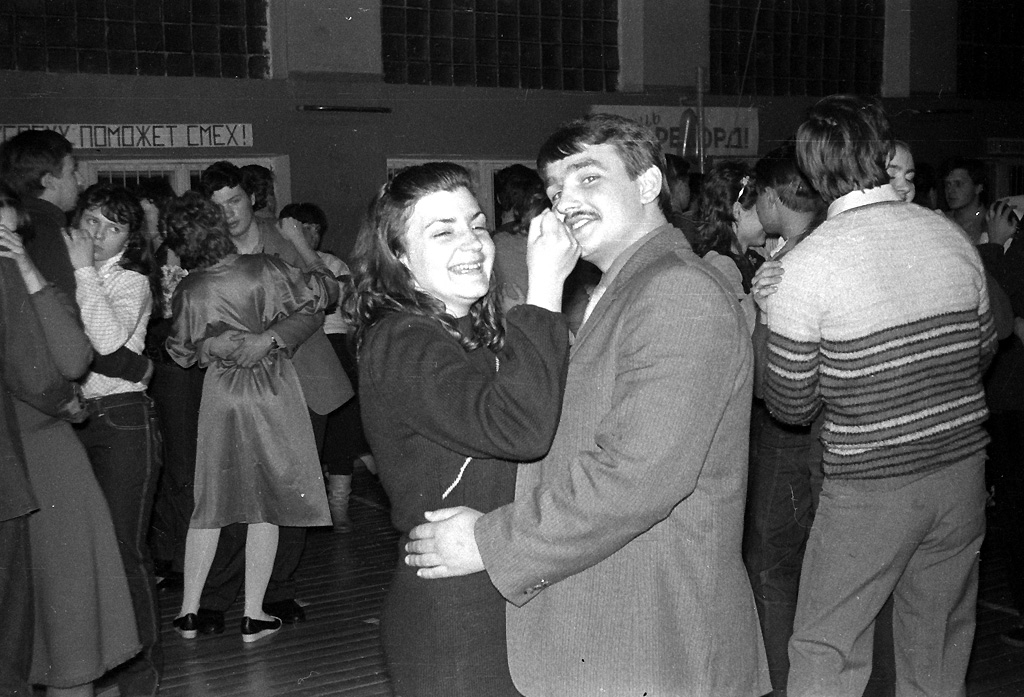 На фото: мой одноклассник Армен танцует "медляк" со старшей пионервожатой. Спортзал, дискотека после "Военно-спортивного конкурса" "А ну-ка, парни!" (в котором соревновались команды старшеклассников и курсантов артучилища) под 23е февраля 1984г. [Свема ФОТО-130, "Смена-8м", вспышка "Саулуте" запитанная от батарейки "Молния" в сумке.]