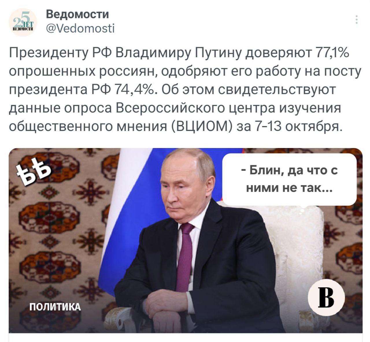 Ну а если серьезно - у меня совершенно нет понимания как окружение пу, те кто до сих пор исполняет его приказы, не сдали его в обмен на индульгенцию, в той или иной форме? Надеются на "победу", думают что смогут дожить свои деньки в относительном комфорте за заборами государственных дач? Или это обреченность?