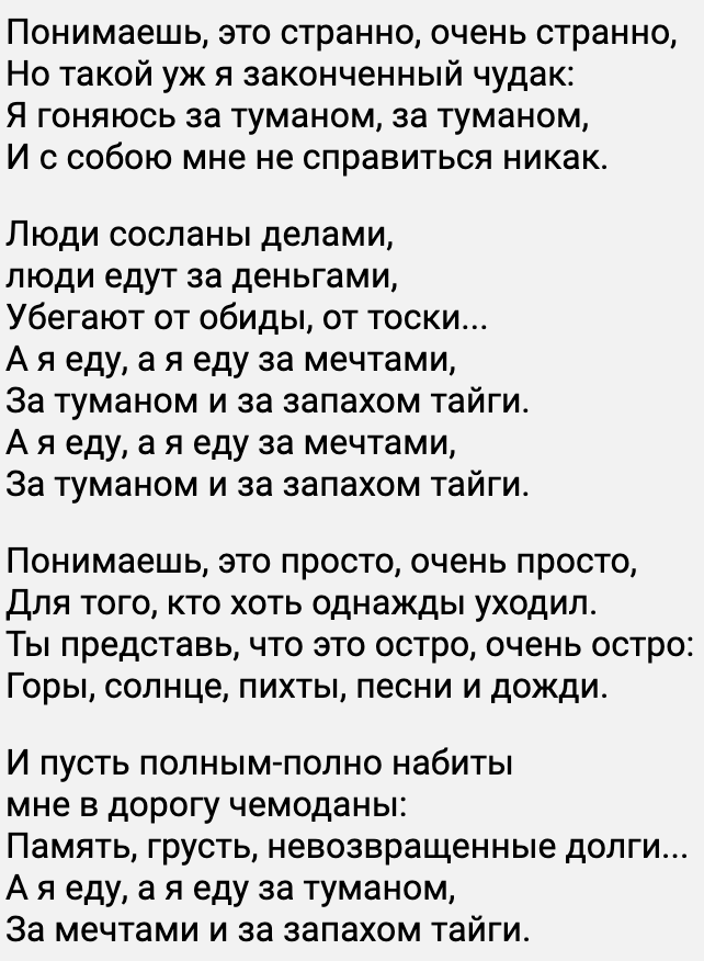 И каким боком приведенная мной версия соответствует оригинальному тексту Кукина? У Кукина было "А я еду, а я еду за мечтами, // За туманом и за запахом тайги", а в слышанной мной шуточной версии было "А я еду, а я еду за деньгами - // За туманом едут только дураки".