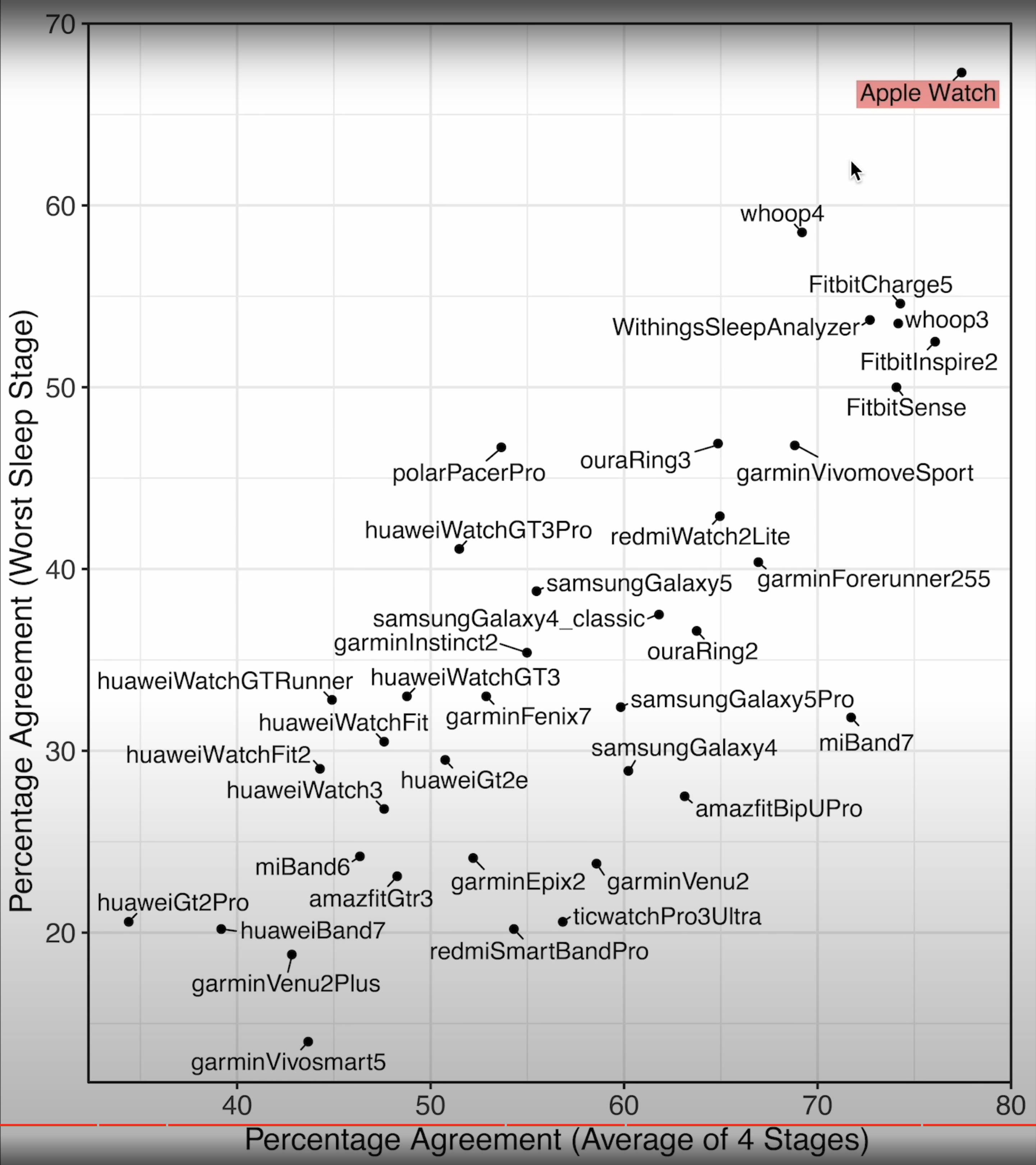 Кстати, в WatchOS9 теперь появилось отслеживание фаз сна (доступно и для прошлых моделей). Тут человек провёл большое исследование, замерял сон разными умными часами и профессиональным устройством. Apple Watch оказались с большим отрывом впереди конкурентов (по схожести показателей с профессиональным гаджетом). Суммарный график под спойлером.