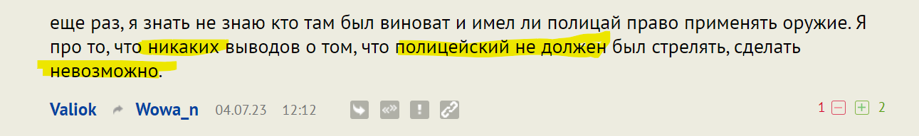 Повторю тем, кто читает невнимательно - мы все обсуждаем сейчас короткое видео, которое показывает момент выстрела полицейского в водителя. и больше ничего. По этому видео я НЕ ВИЖУ угрозы жизни полицейскому и его напарнику. мы не видим в каком состоянии был водитель. Мы видим уезжающую машину и выстрел в лобовое стекло, подразумевающий, что это выстрел на поражение.