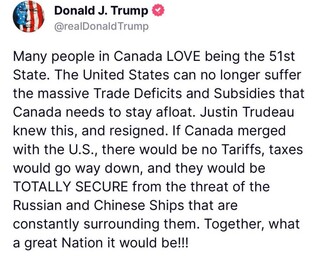 Трюдо объявил, что уходит с поста лидера Либеральной партии, что автоматически лишает его поста премьер министра Канады. Сейчас парламент отправлен на каникулы до 24 марта. За это время будет выбран преемник. Шансы либералов на победу в следующих парламентских выборах весьма туманны. Трюдо даже не хромая утка, он - дохлая утка.