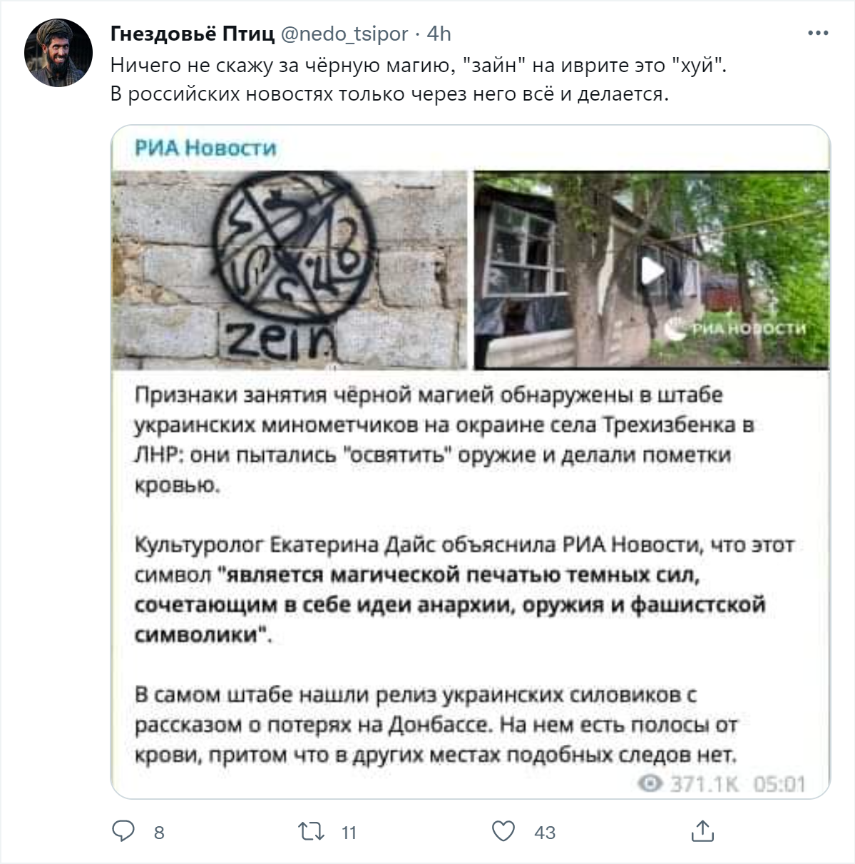 Попрошу заметить, что они опять упоминают евреев в негативной (для россии) ассоциации с украинцами - приплели иврит к простигосподи "чёрной магии".