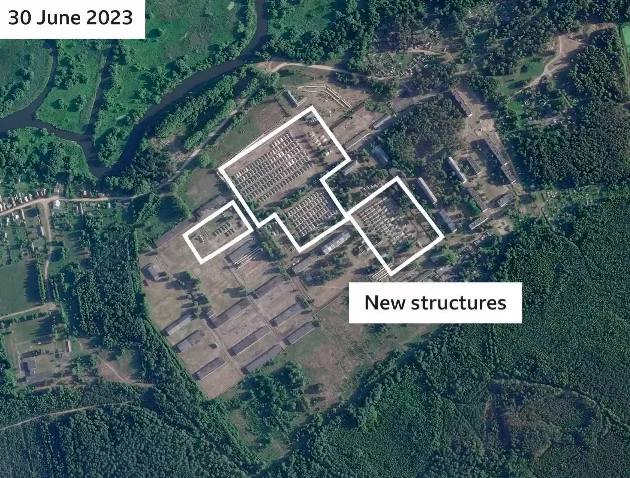 BBC опубликовал новый спутниковый снимок Planet Labs с базой ЧВК «Вагнер» около поселка Цель в Беларуси.