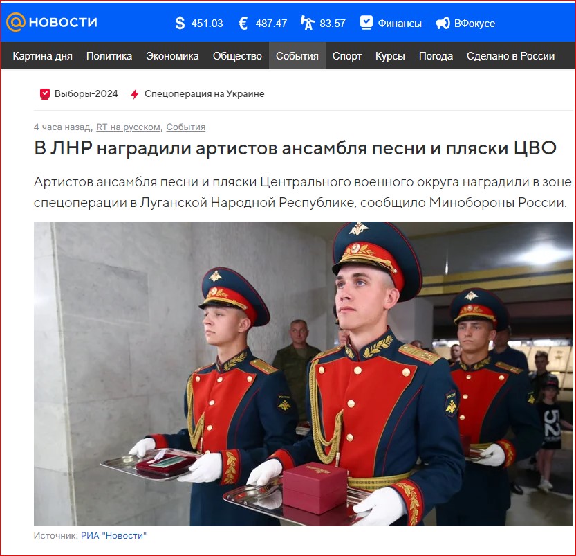 Артистов ансамбля песни и пляски Центрального военного округа наградили в зоне спецоперации в Луганской Народной Республике, сообщило Минобороны России.