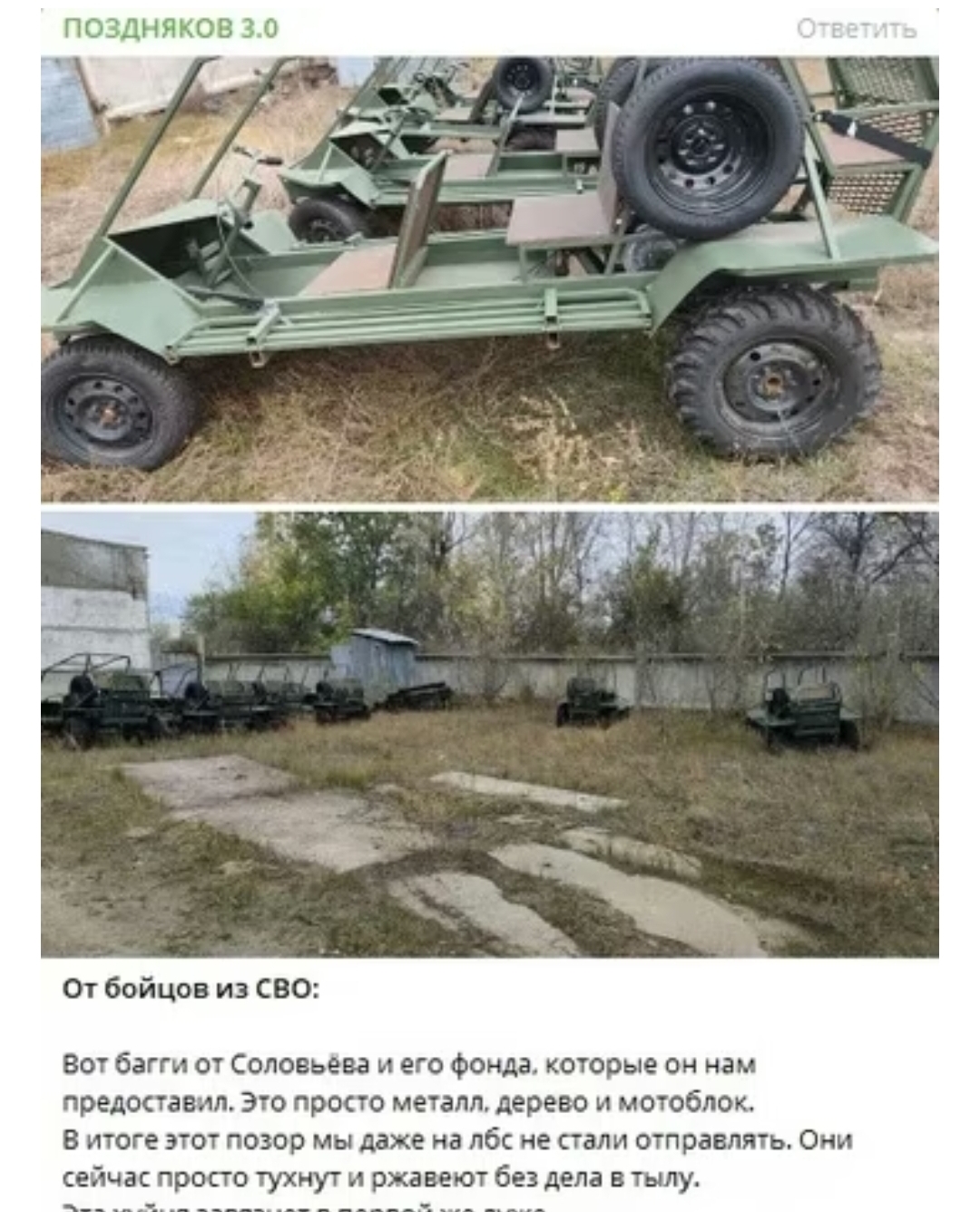 В общем, Соловьев молодец на самом деле. Чел реально собирает кучу денег на помощь "нашим мальчикам", причем почти все деньги пилит. Помощь либо совсем маленькая, либо совершенно негодная. А деньги по карманам. И ещё всячески пытается гробить конкурентов. Хороший мальчик, короче. На киче ему надо будет льготное место выделить. А Монтян сотоварищи под шконку у параши.