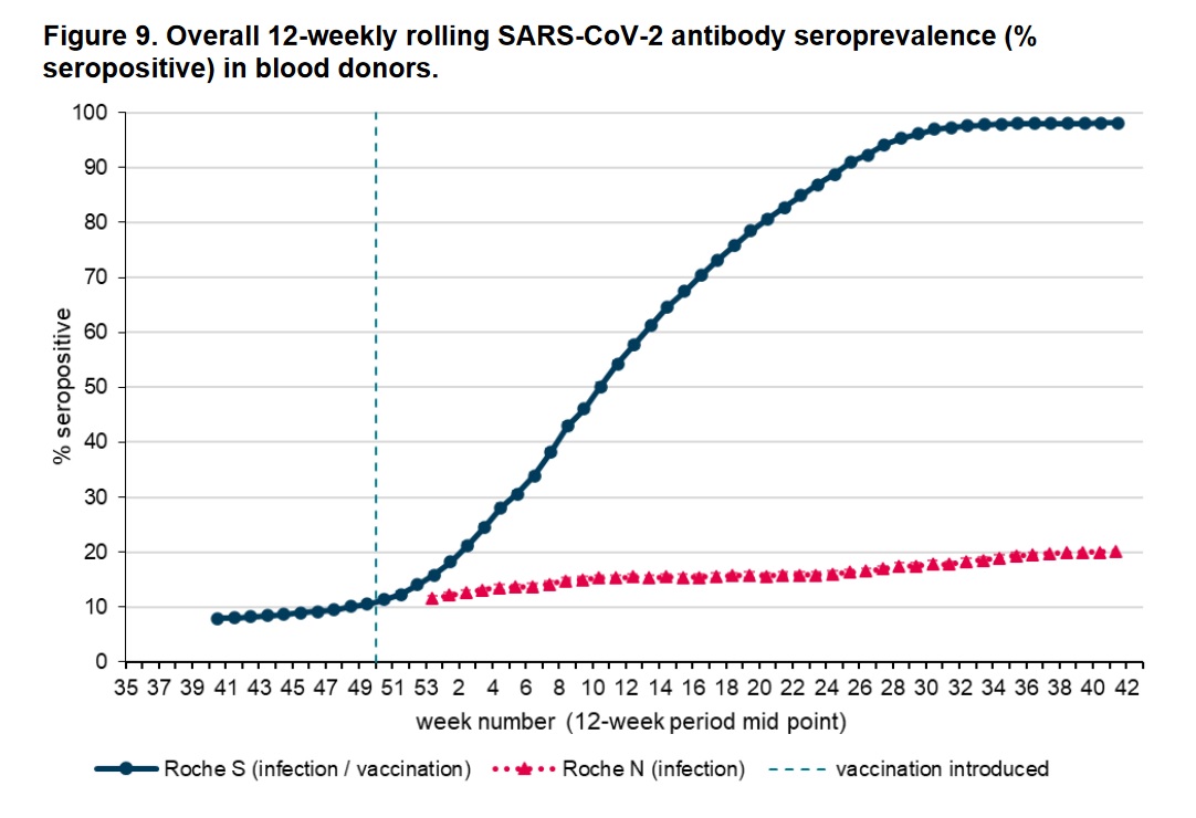 Вот, например, данные по анализу крови английских доноров. Красная линия - переболевшие, синяя - переболевшие и вакцинированные.