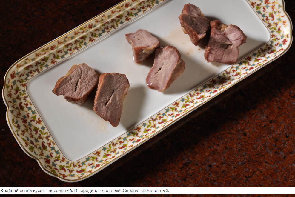 Сталика, со всем как он говорит опытом, однозначно надо воспринимать with a grain of salt: вот на картинке его "эксперимент", явно демонстрирующий, что щепотка соли уничтожает в ноль всю структуру волокон мяса. При этом в тексте он пишет совсем другое. Чему верить - картинке или буквам решайте сами. Но если он и лево с право умудряется там ещё в самом начале поста путать, то как-то жестоко называть это "мощным постом", да ещё и "в тему", если только вы не хотели изначально поиздеваться над Сталиком.
