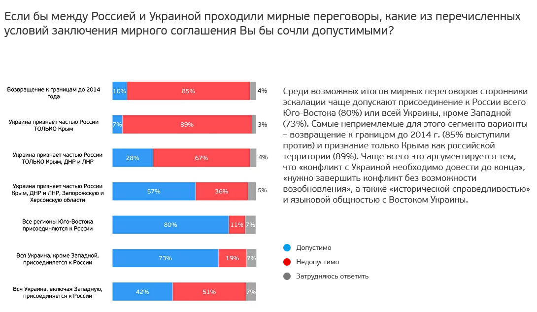 Не стоит пытаться интерпретировать этот опрос как определение числа сторонников Украины/РФ в широком смысле. Он только про эскалацию.