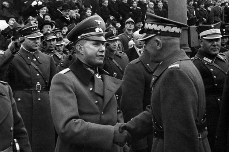 Opis obrazu: Marszałek Edward Rydz-Śmigły wita się z attache wojskowym Niemiec pułkownikiem Bogislavem von Studnitzem.