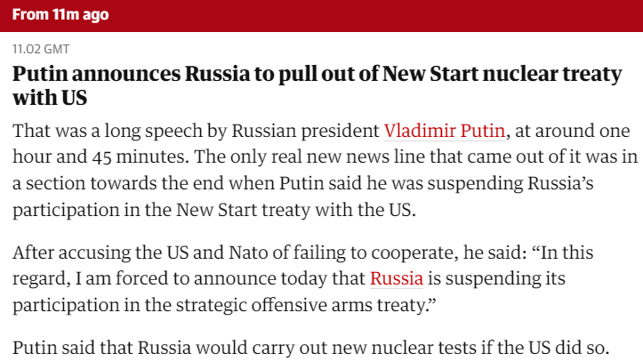 Вишенка на торте - РФ приостанавливает участие в ДСНВ (СНВ-3), гонка ядерных вооружений официально перезапускается.