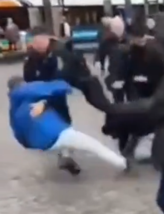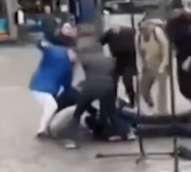 - Чувак в синей кутке лупит этого чувака в черной куртке, пока его (синего) не сбиваетс ног полицейский.