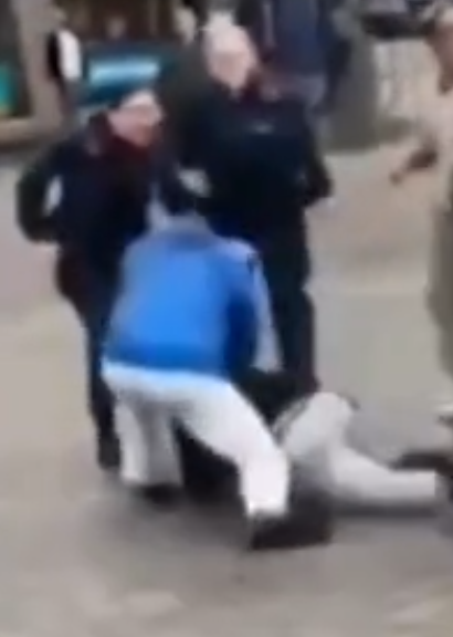 Синяя куртка перепутал, пиздит кого-то почем зря. Полицай его скрутил. В моменте мигрант на земле был. Пока полицай синюю куртку крутил, мигрант вскочил. У полицая на спине глаз нет.
