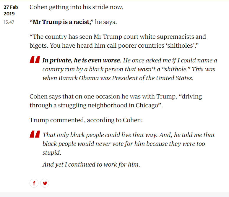 Он также рассказал, что однажды, когда он ехал с Трампом по неблагополучному району в Чикаго, тот сказал, что только чернокожие могут так жить, а также добавил, что афроамериканцы не станут за него голосовать, потому что слишком тупы для этого.