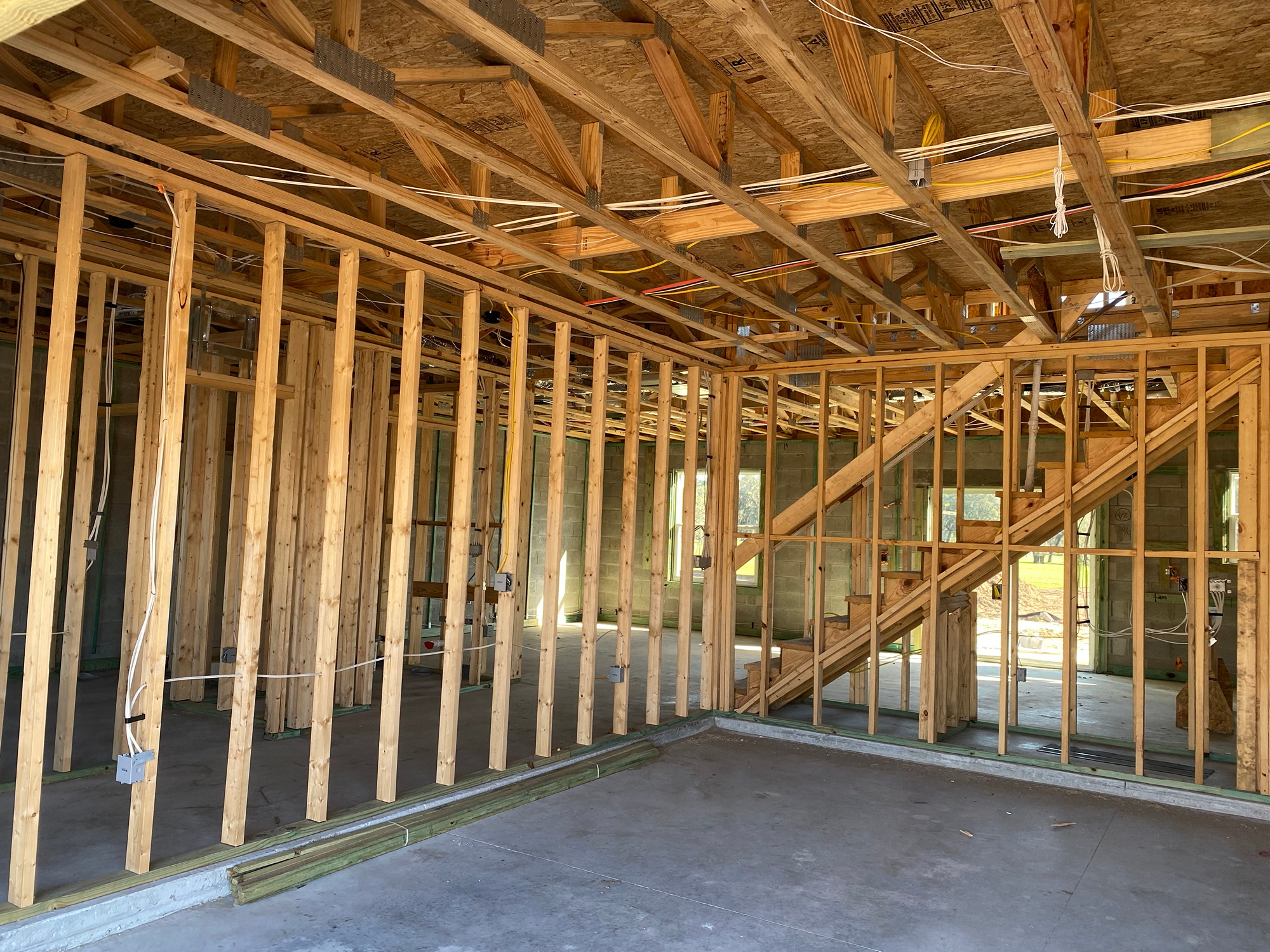 Первый этаж все-таки снаружи имеет кирпичные стены (их видно за палками). Внутри же всё вот такое, потом там ставится drywall (типа гипсокартона). А второй этаж сразу строится из таких палок, только снаружи ставят специальный гипсокартон (или типа того), более прочный и влагоустойчивый. И набивают пространство между наружным и внутренним теплоизолирующим материалом.