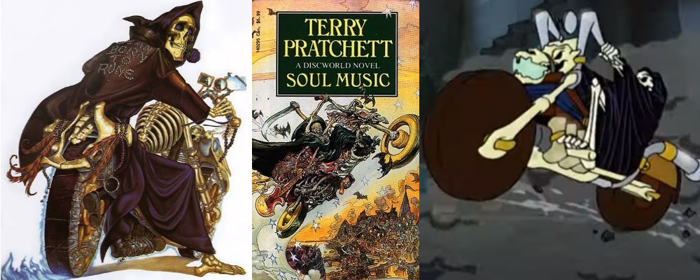 Музыка Рока подействовала на всех. Пока волшебники красили спальни в чёрный, а служанки распевали в коридорах, Библиотекарь был занят важным делом. Он собирал для Смерти мотоцикл. Это глядя на него декан восклицает: «Триумф!». «Триумф» — британская марка мотоциклов, по истории и качеству сравнимая с «Харли-Дэвидсон».