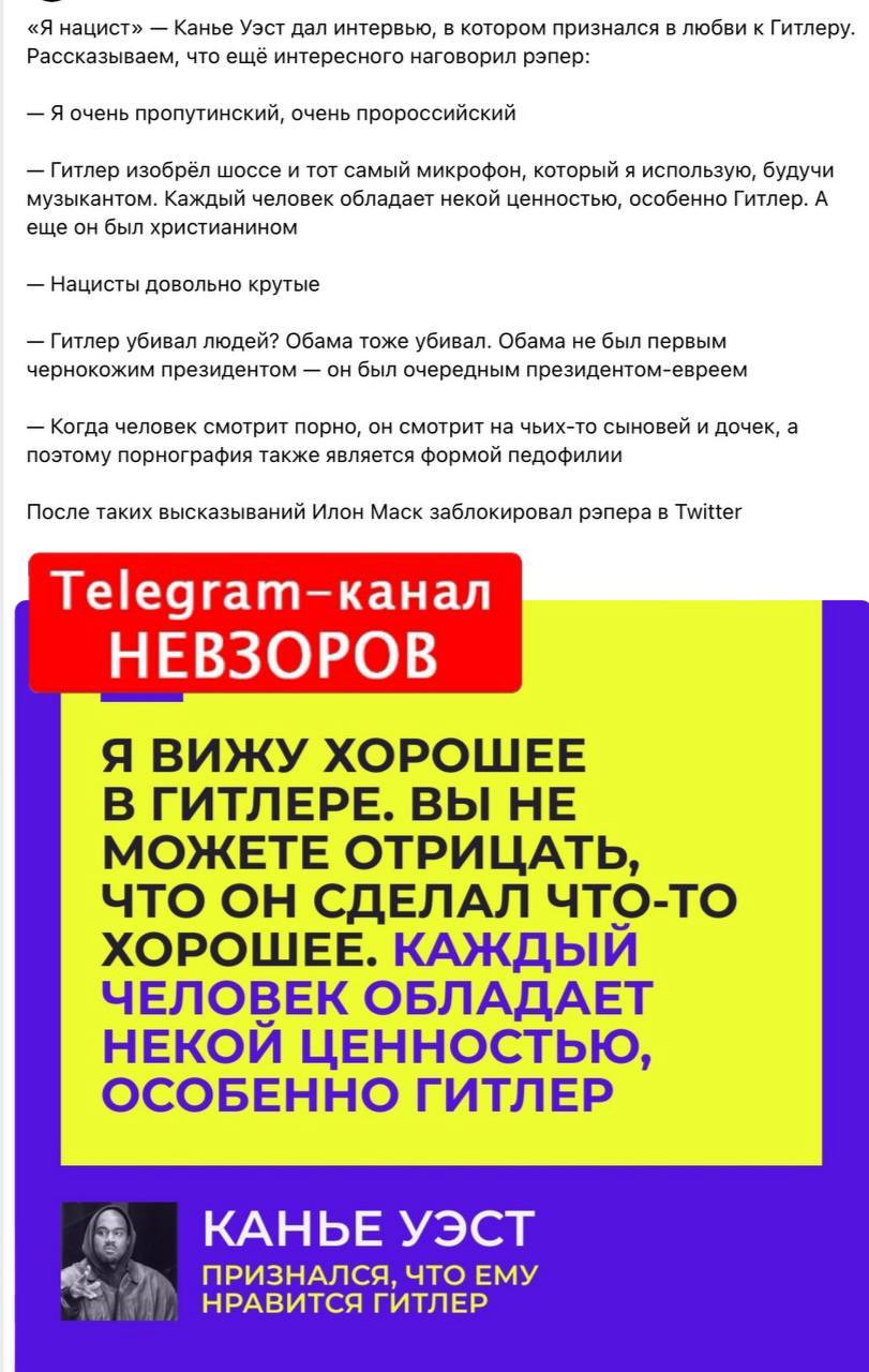 Уэст за Путина. Поэтому он может делать что угодно и быть кем угодно, его не осудят. Если только он его негативное поведение положат Путину в папочку, и тот разгневается.