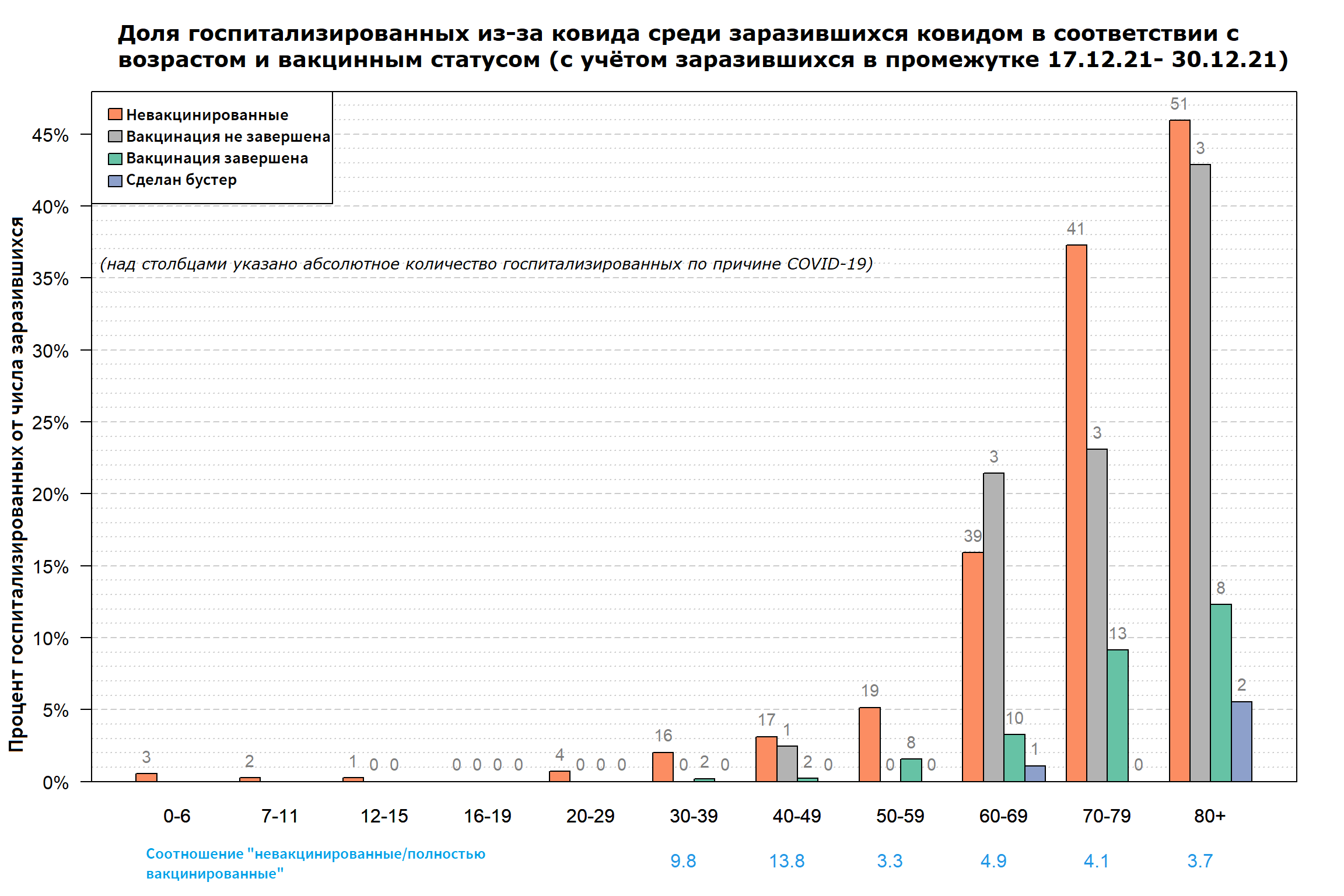 Если же по цифрам данного исследования просто просуммировать число госпитализированных Невакцинированные+Недовакцинированных (695) и полностью Вакцинированные (270) без учета % вакцинации и возрастной группы, то выйдет как раз 2.5 - примерно такие цифры нам и показывает ежедневная статистика (30% госпитализированных вакцинировано и 70% невакцинировано)