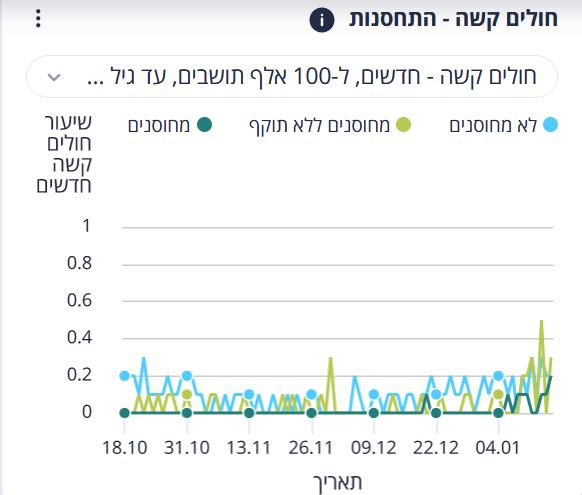 На этом графике приведены количество и доля тех, кто был госпитализирован по причине тяжелого протекания заболевания COVID-19 (в их число не включены ковид-позитивные пациенты, оказавшиеся в больнице по иным причинам). Таким образом, график иллюстрирует вероятность тяжелого протекания COVID-19 для заразившегося человека.