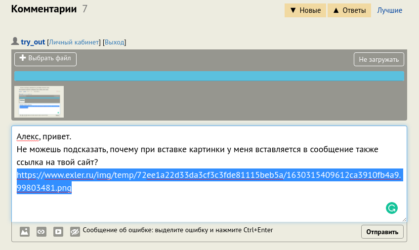 Не можешь подсказать, почему при вставке картинки у меня вставляется в сообщение также ссылка на твой сайт?
