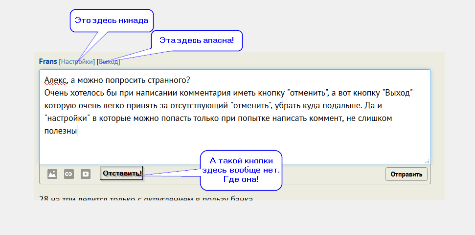 Очень хотелось бы при написании комментария иметь кнопку "отменить", а вот кнопку "Выход" которую очень легко принять за отсутствующий "отменить", убрать куда подальше. Да и "настройки" в которые можно попасть только при попытке написать коммент, не слишком полезны