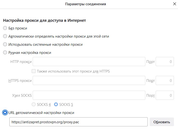 Вставить ссылку antizapret.prostovpn.org в строку "URL автоматической настройки прокси".