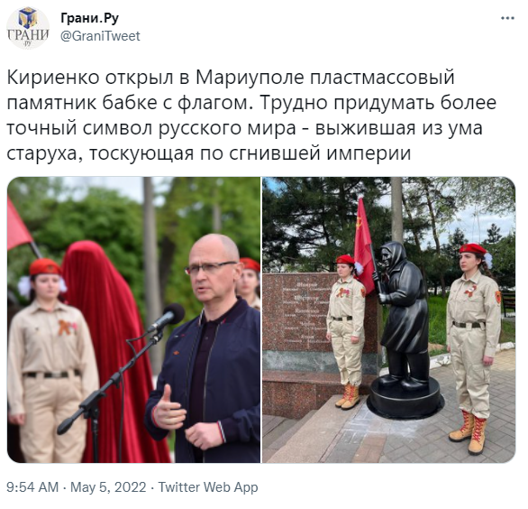 В России из этой бабушки сделали символ. Появилась информация, что она из Дмитриевки Киевской области. Появилась информация, что ее чудом из-под носа украинских карателей выкрал сын и вывез в Россию (назывался даже, прости небо, Барнаул). Появились муралы с изображением бабушки. Появились люди, посаженные на осквернение муралов с изображением бабушки. Появились памятники бабушке. Были снесены памятники бабушке, потому что люди на них карабкались. Сегодня утром чудовищный памятник бабушке поставили в оккупированной части Мариуполя!