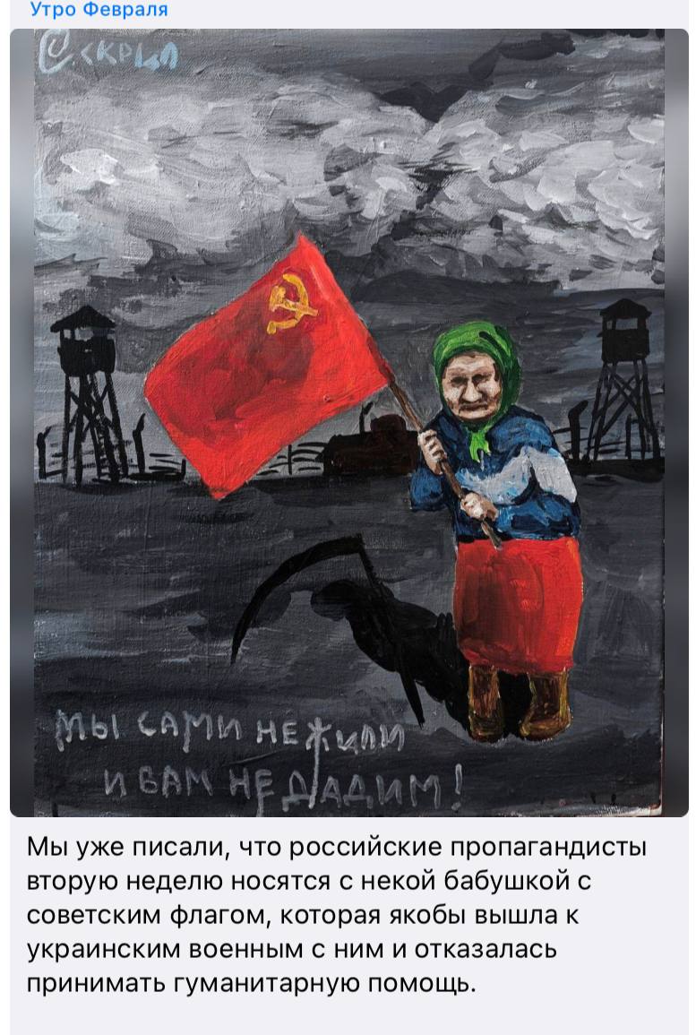 - флаг меняется на продукты, бабушка обнимается. Флаг топчется позже. Посыл: даже такие люди прозревают и ВСУ помогает избавиться от коммунизма в мозгах