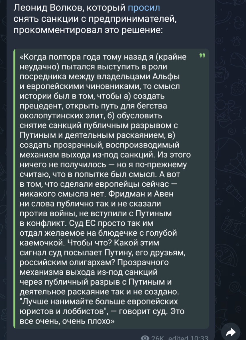 А вот в том, что сделали европейцы сейчас — никакого смысла нет. Фридман и Авен ни слова публично так и не сказали против войны, не вступили с Путиным в конфликт. Суд ЕС просто так им отдал желаемое на блюдечке с голубой каемочкой. Чтобы что? Какой этим сигнал суд посылает Путину, его друзьям, российским олигархам?