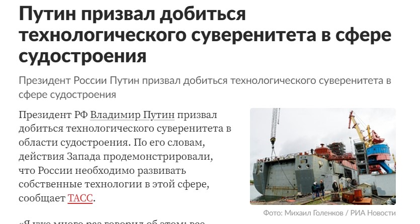 «Я уже много раз говорил об этом: все импортозаместить невозможно, да и не нужно этого делать. Но добиваться технологического суверенитета по критическим позициям судового оборудования, по самым значимым производственным процессам и технологиям — нужно», — заявил российский лидер в четверг, 18 августа, на совещании по развитию судостроительной отрасли.