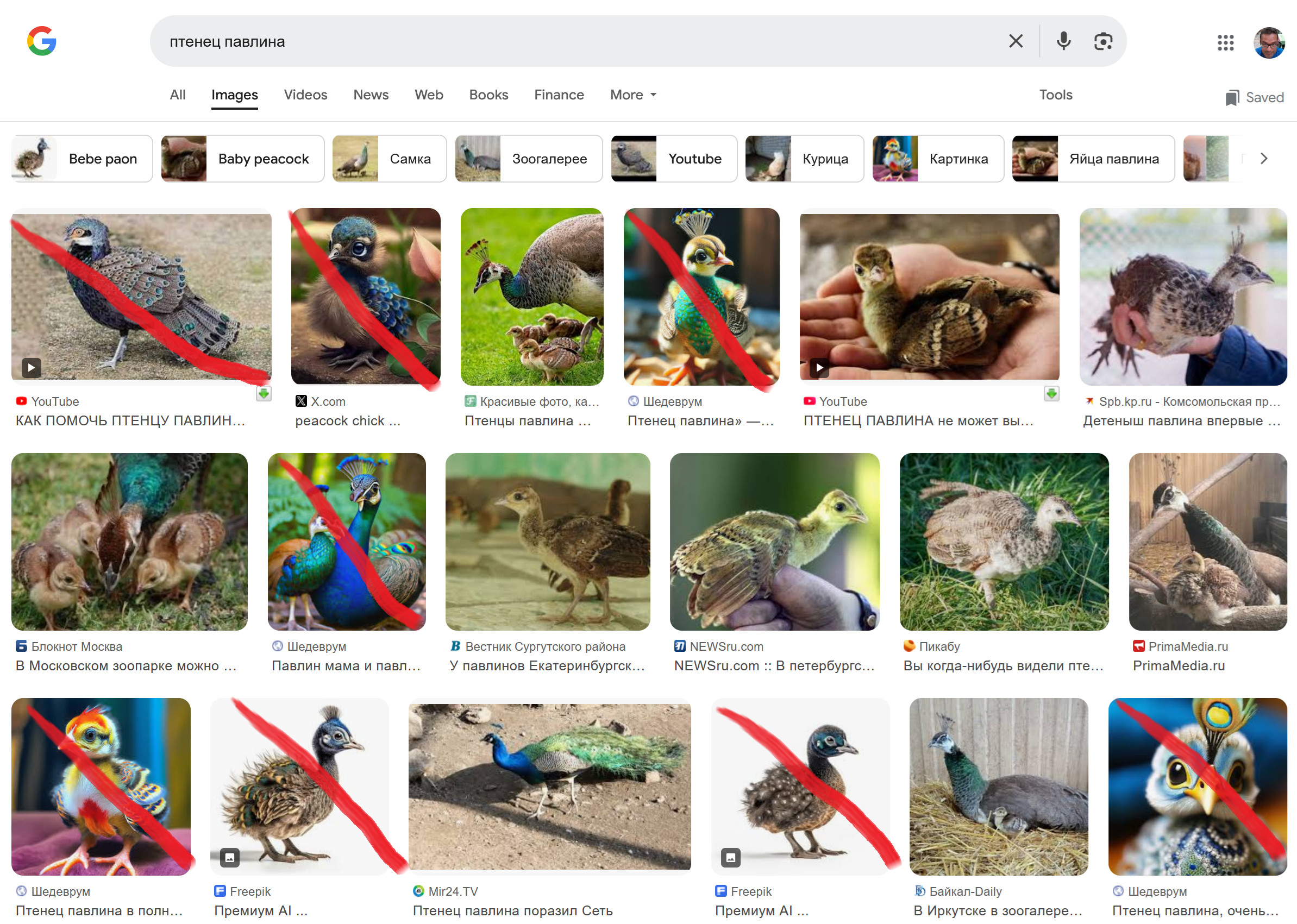 если ты попробуешь поискать "baby peacock", то там будет гораздо больше сгенерённых AI картинок.
