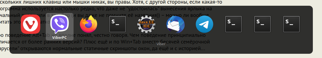 Про поведение Alt+Tab не вполне понял, честно говоря. Чем поведение принципиально отличается от более ранних версий? Плюс ещё и по Win+Tab вместо бесячей семёрочной "карусели" открываются нормальные статичные скриншоты окон, да ещё и с историей...