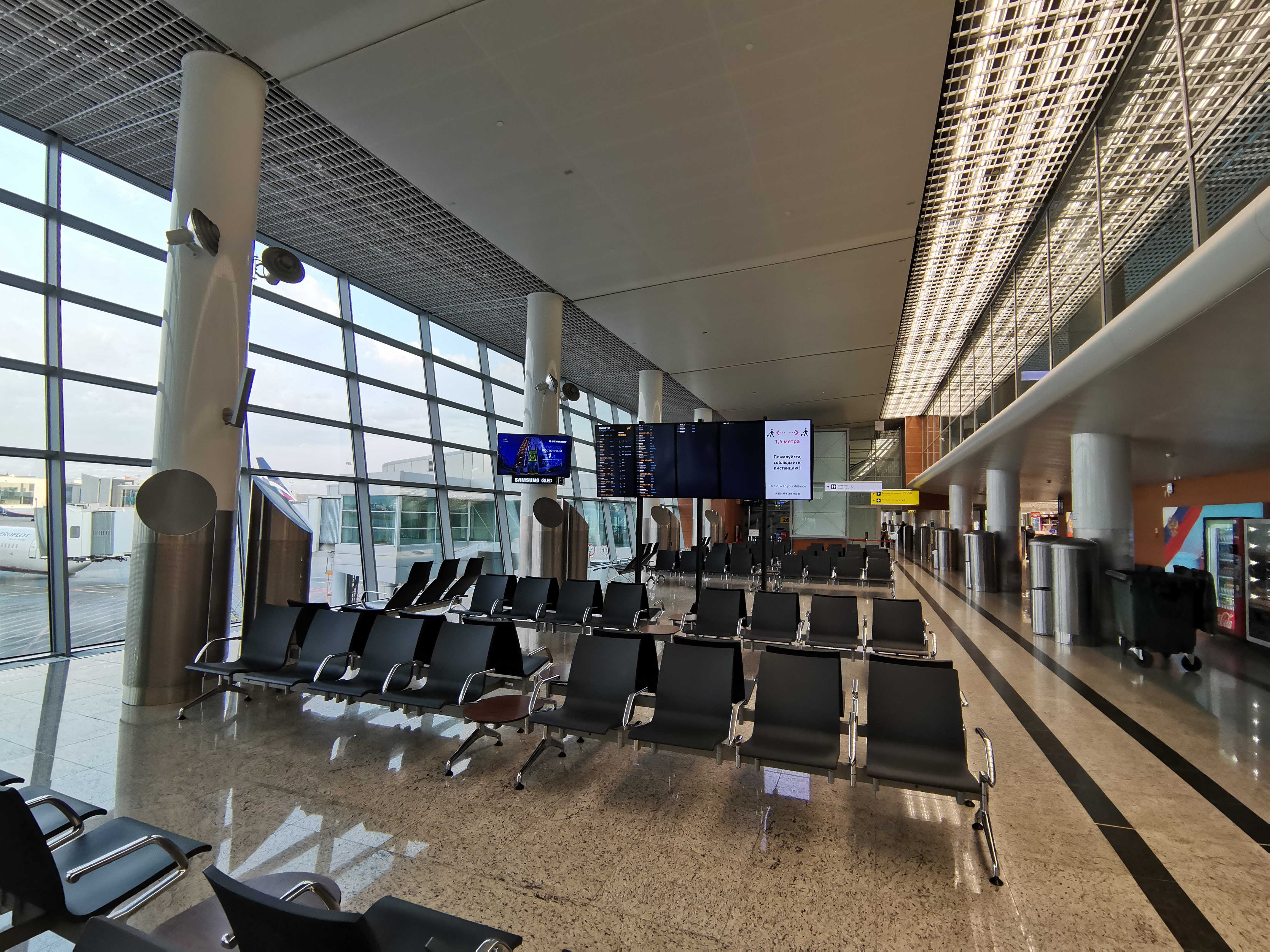 Пустое Шереметьево выглядит как-то нереально и оставляет какое-то угнетающее ощущение. На табло несколько строчек вылетов с интервалами в час и более.