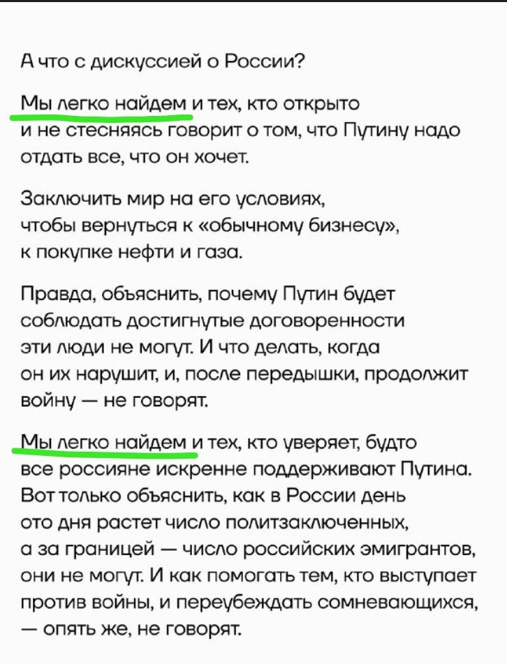 Если Раху когда-то решат активно "добить" в разумные по меркам человеческой жизни сроки в силу каких-то новых причин то это будет в силу прагматичных интересов западных элит а не потому что Навальная или Кара-Мурза донесут эстеблишменту что это вообще кул, и украинцам и россиянам будет житься от этого лучше а ближнем европейцам спокойнее. На это вообще всем положить.