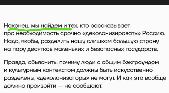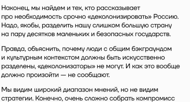 Правда, объяснить, почему люди с общим бэкграундом и культурным контекстом должны быть искусственно разделены, «деколонизаторы» не могут. И как это вообще должно произойти — не сообщают.