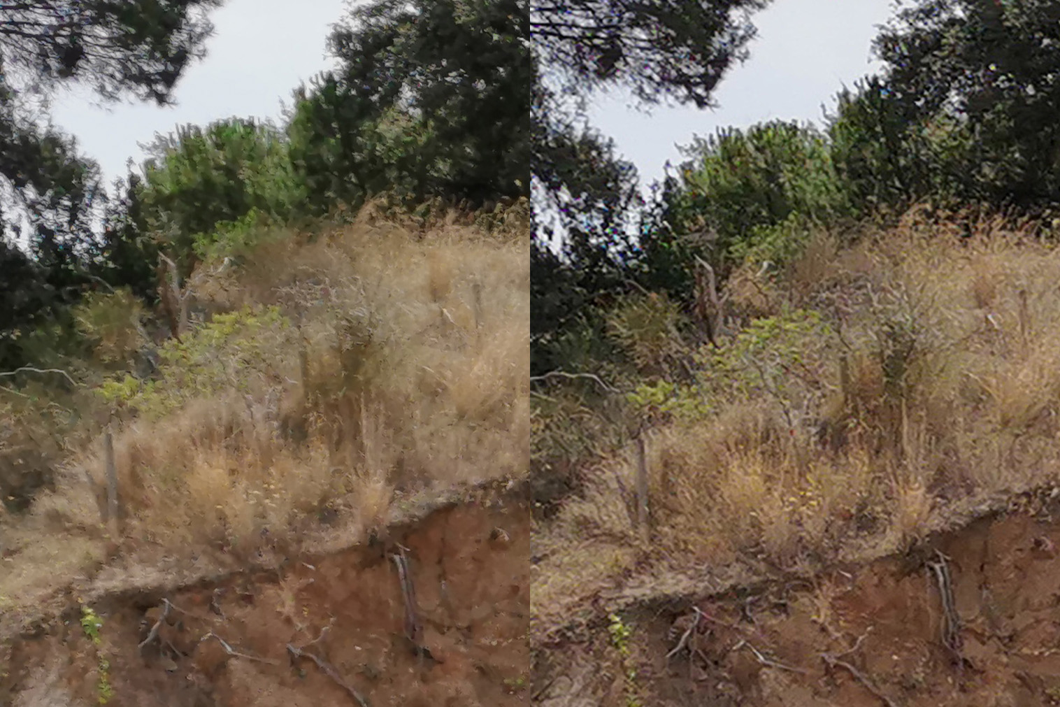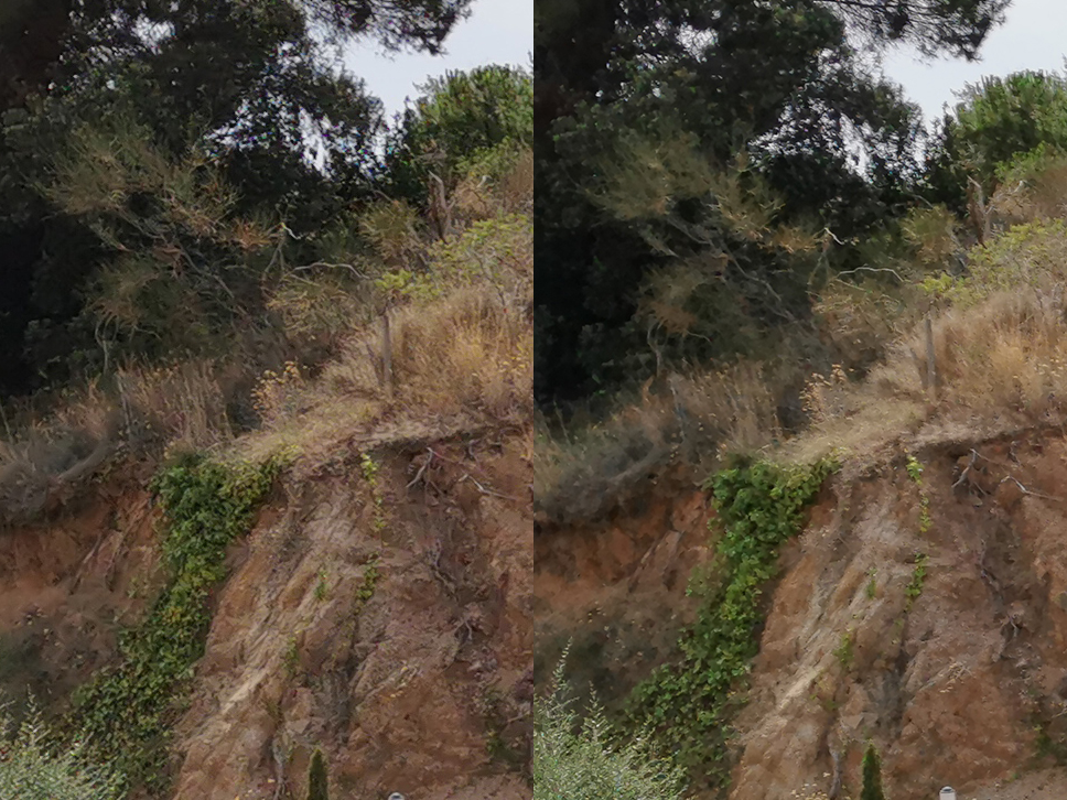 Но в этих идеальных условиях, почему то начинают использоваться "улучшайзеры", которые на половине изображения убивают детали полностью. Я рассматриваю куст на переднем плане и вижу странную картину. Рядом соседствуют отчетливо прорисованные детали листьев с какой-то мазней. Если у вас матрица обеспечивает такую детализацию, то почему я вижу однотонную мазню, а не четкие детали листьев? И тут напрашивается ответ. Нет на самом деле никакой супердетализации, есть просто мощная постобработка, при которой возможно определение и выделение за счет контрастности нечетких элементов изображения и дорисовывания им резкости. А там, где зацепиться процессору не за что (массив мелких деталей при отсутствии контраста) там алгоритмы дорисовывания резкости не работают. Но почему бы тогда не оставить в этих областях все как есть? У нас же идеальные условия - шумов быть не должно, а матрица с оптикой должны обеспечивать фантастическую детализацию. Полагаю, причина в том, что картина там отнюдь не столь радужная. Вот и грохают все наглухо там, где программно дорисовать не смогли.
