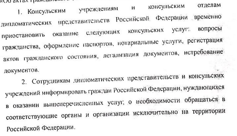 Согласно проекту приказа, который имеется в распоряжении «Новой», возможна «временная приостановка оформления паспортов, оказания нотариальных услуг, услуг по легализации и истребованию документов, решения вопросов гражданства» консульскими учреждениями МИД РФ за рубежом.