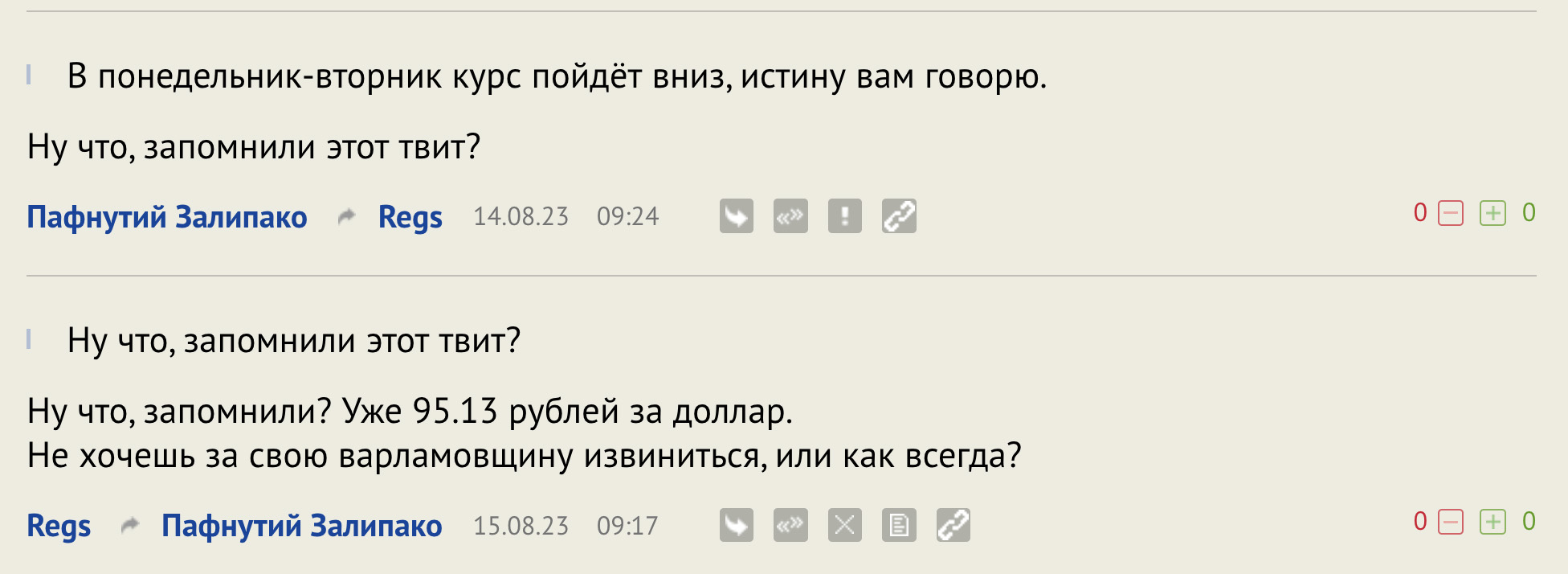 P.S. кстати, там в теме про доллар по 100 рублей, я говорил, что в понедельник-вторник курс пойдет вниз (сейчас уже 95.78 рублей за доллар). А в ответ ряд персонажей во главе с Пафнутием улюлюкали и зачем-то упоминали Варламова с Кацем.