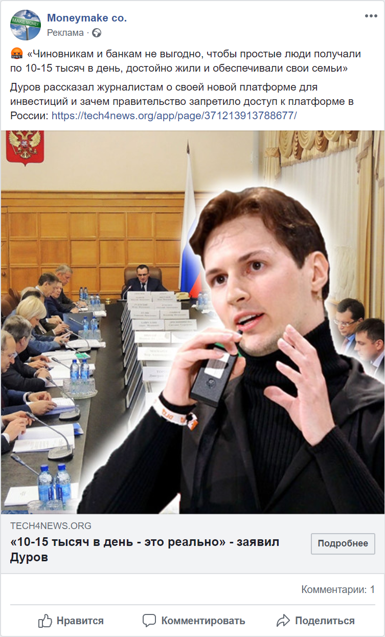 В общем, жулье начинает окучивать facebook по полной, а тот способствует (ну так ведь жулье честно платит за буст поста, че уж там, ничего личного, просто бизнес).