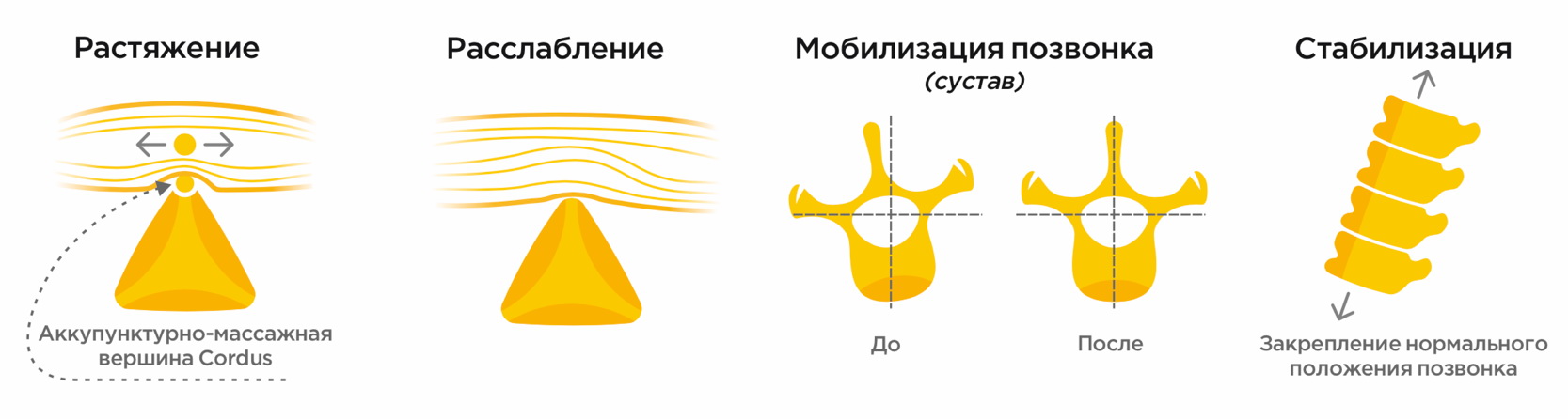 Как работает аппарат Cordus (Кордус). Его задача – мягко, нетравматично, под весом самого пациента погрузиться в околопозвоночные мышцы на глубину до 2,8 см и снять их спазм/перегрузку. Именно спазм/перегрузка глубоких околопозвоночных мышц в ответе за 85-90% всех проблем со спиной и позвоночником, что может подтвердить любой мануальный терапевт, массажист, реабилитолог [Steven D. Waldman M.D., 2014; Isajkin A.I., Shevcova G.E., Rozhkov D.O., 2017].