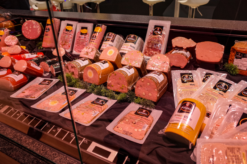 Schara - очень известный производитель, я их продукцию часто встречаю в сетевых магазинах. Они любят делать всякие колбасы и рулеты с добавками - яйцо, оливки, орешки и так далее.