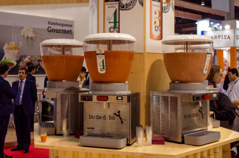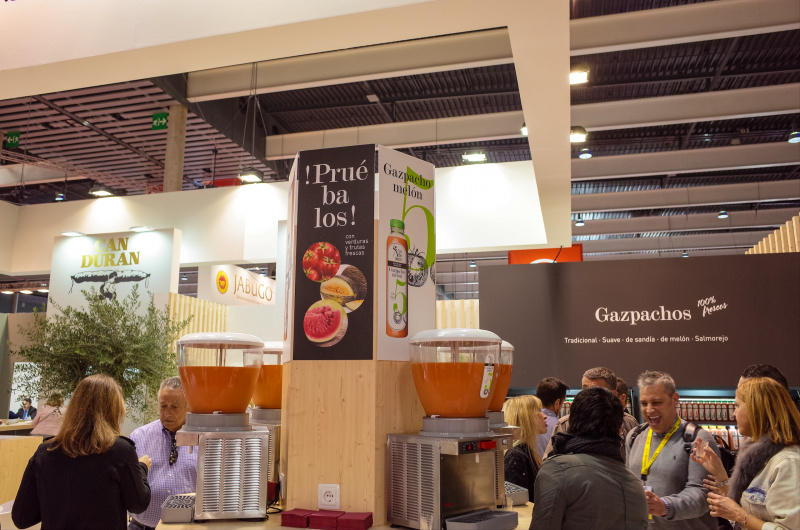 Эта фирма делает гаспачо из свежих продуктов. Хранится это все очень недолго, но зато вкусное и свежайшее. На стенде все можно было пробовать: традиционный гаспачо, острый гаспачо, гаспачо с дыней и гаспачо с арбузом. Довольно прикольно, кстати.