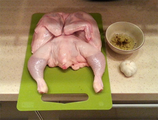 В плошку наливается оливковое масло, в которое также добавляется соль и перец. Берутся 2-3 зубчика чеснока, нарезаются небольшими кусочками. В мясистых частях цыпленка делаются надрезы ножом, туда засовываются кусочки чеснока. Далее тушка обмазывается подготовленным маслом. Я также еще добавляю чесночного соуса "Табаско".