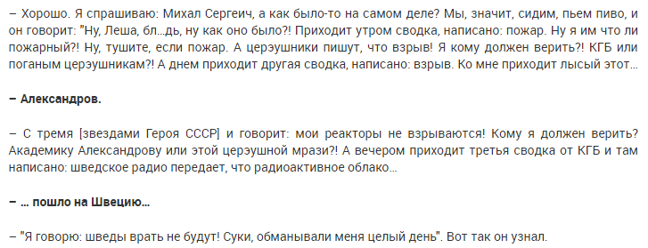 Второе и главное. Военные дятлы, которым была поставлена задача успокоить паникующих гражданских, не знали, что именно там рвануло и как оно устроено. Поэтому строить конструкцию, типа там не было цезия, а у врача цезий из крабов - значит гнать пургу.