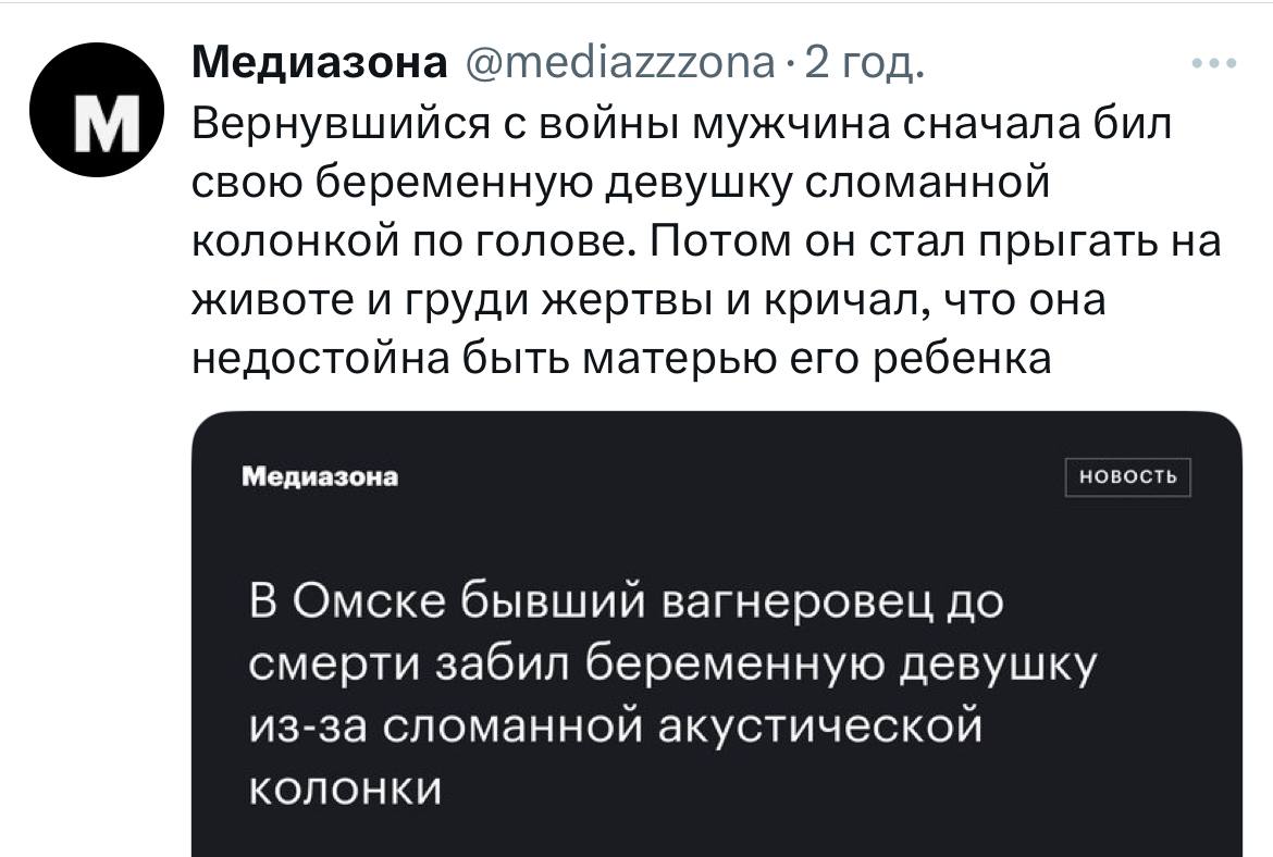 О, а вот помогите разобраться, кто знает - я сколько ни слежу за новостями (почти обсессивно), но понял, что у меня пробел в общей картине. Регулярно появляются сообщения такого рода про СВОшников, которые кого-то убили, изнасиловали, избили и т.д. Пытаюсь понять масштаб катастрофы, нынешней и будущей (Пригожин говорил про зэков, что это "отдельные случаи", ну мало ли 😄).