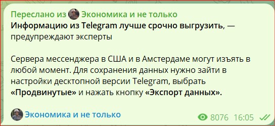 Сервера мессенджера в США и в Амстердаме могут изъять в любой момент. Для сохранения данных нужно зайти в настройки десктопной версии Telegram, выбрать «Продвинутые» и нажать кнопку «Экспорт данных».