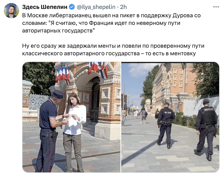 Член Либертарианской партии России вышел на пикет с плакатом с надписями на русском и французском языках. По-русски на плакате написано: «Я/Мы Дуров. Франция, не ходи по стопам Путина: уважай свободу слова! Свободу Павлу Дурову!» По-французски написал тот же текст, но начинается он со слов «Je suis Pavel».