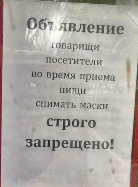 Я, кстати, и не сомневался, что это примут с полтычка. Какие-то разумные предложения они могут месяцами рассматривать и обсуждать, а всякий дебилизм тут же принимается. Со страшной силой поздравляю местных бегунов и велосипедистов - вот им радость-то. Впрочем, не сомневаюсь, что бегуны и велосипедисты маски носить не будут. Я, во всяком случае, на велосипеде ездить в маске совершенно точно не собираюсь (а я восстановил велосипедный сезон). Ну, точнее, носить-то маску я буду, как этого требуют взбесившиеся чиновнички, но на бицепсе, как я ее и раньше носил.